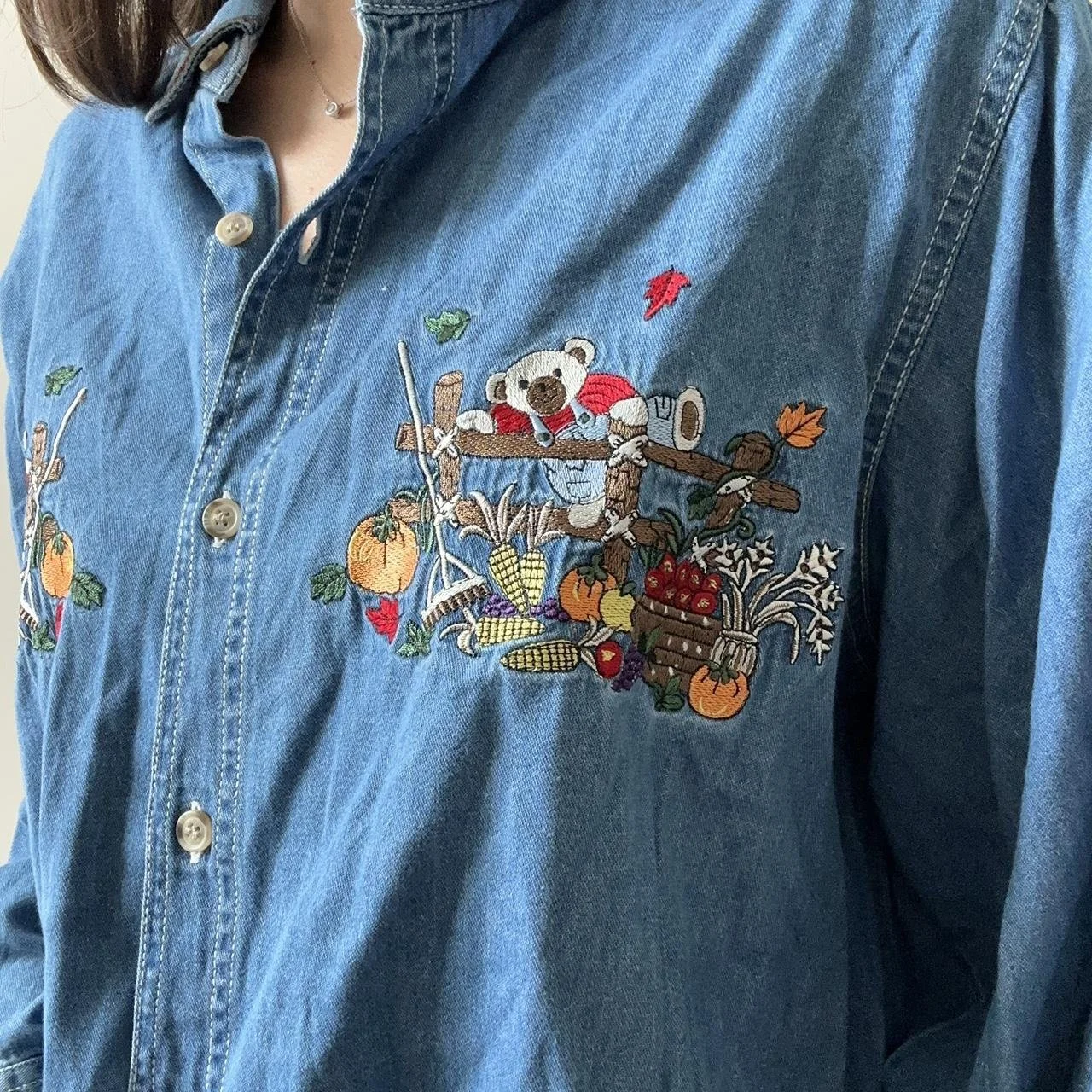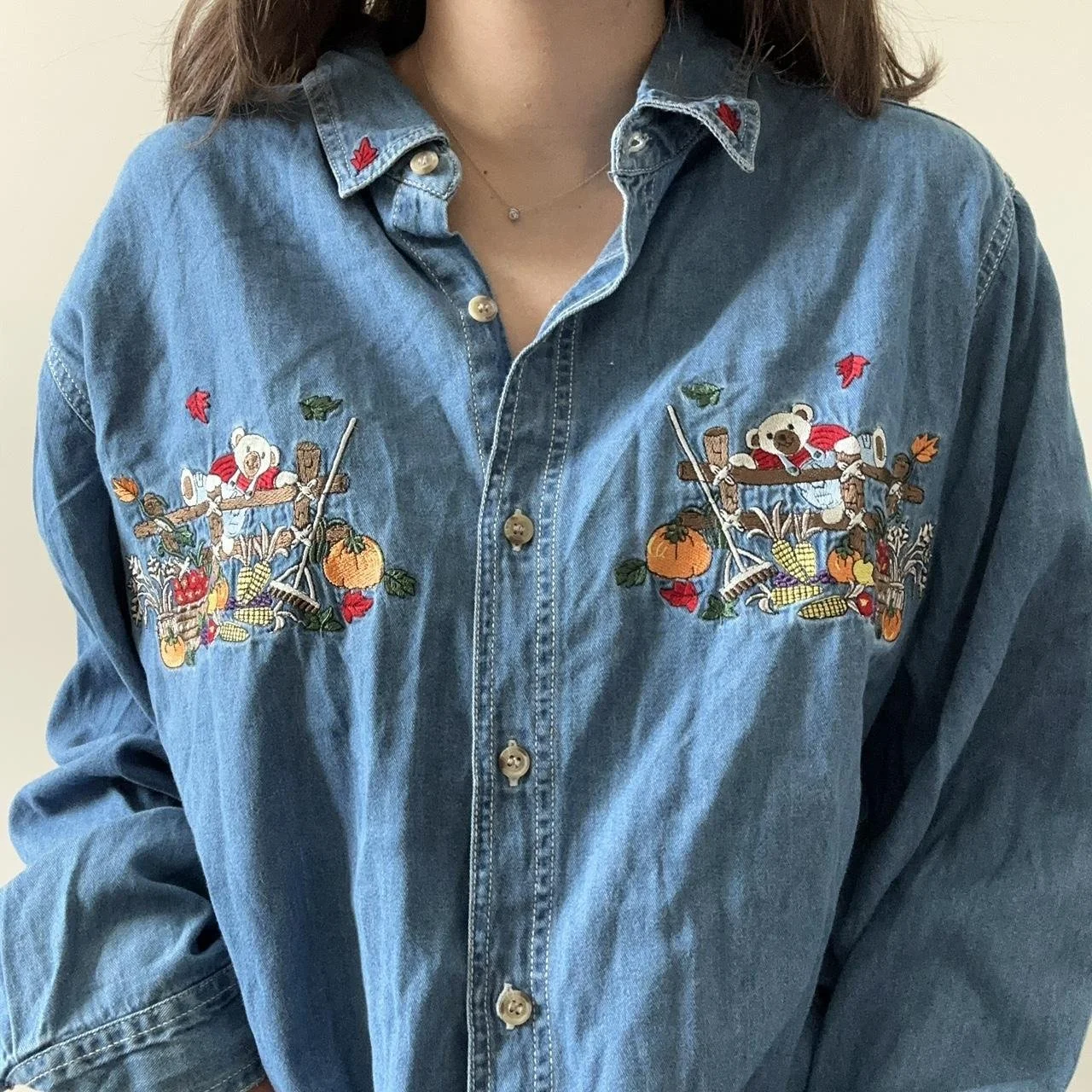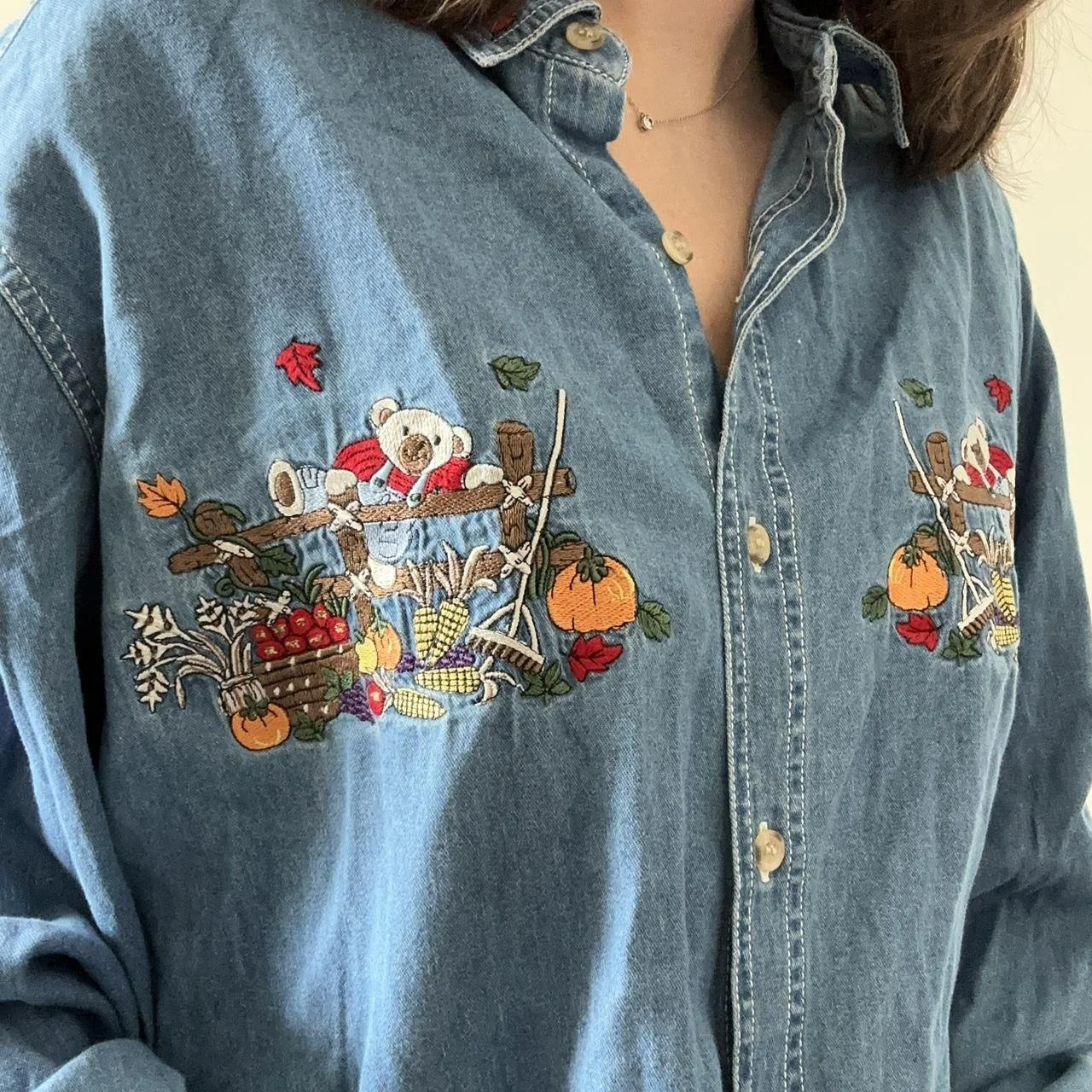 the perfect fall denim top! this denim button down could go for an oversized or fitted look, the detials are perfect for any fall lover, with bears sitting in barrels full of pumpkins and colorful leaves surrounding! size 3xl