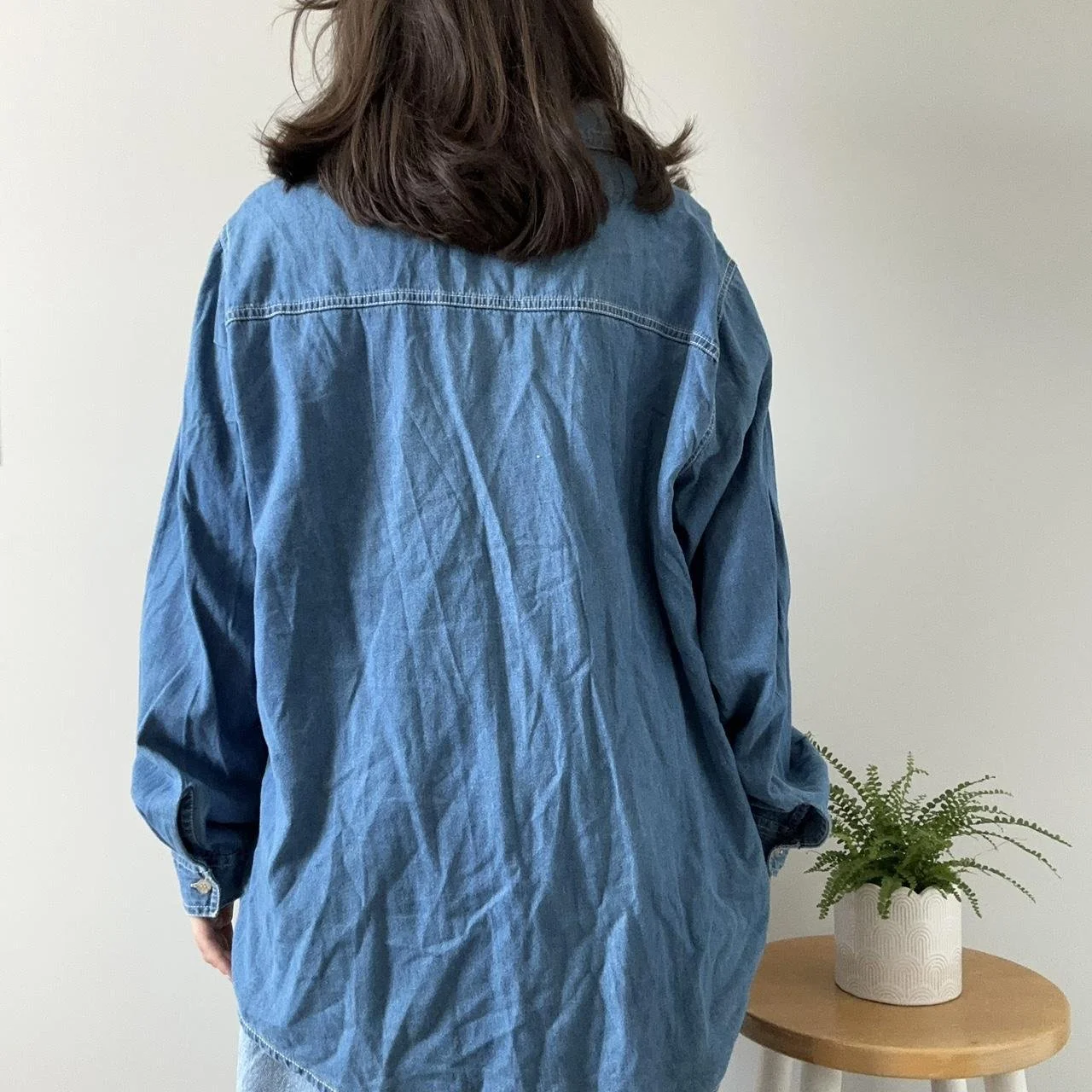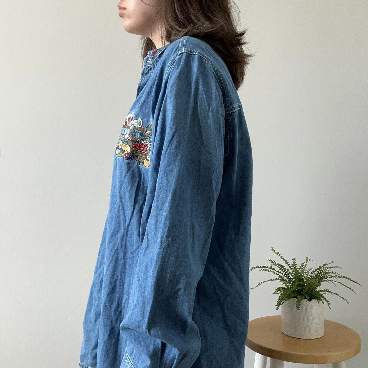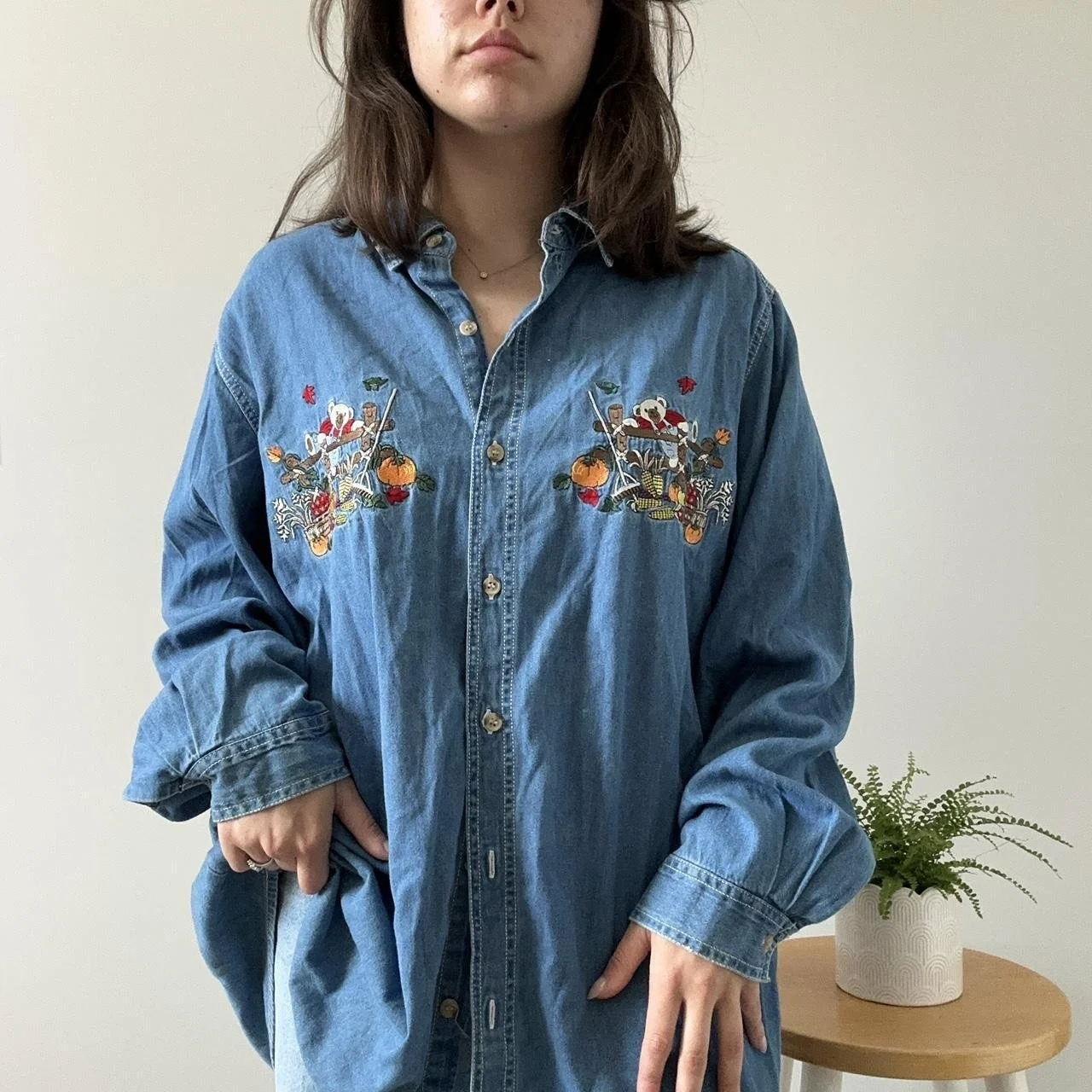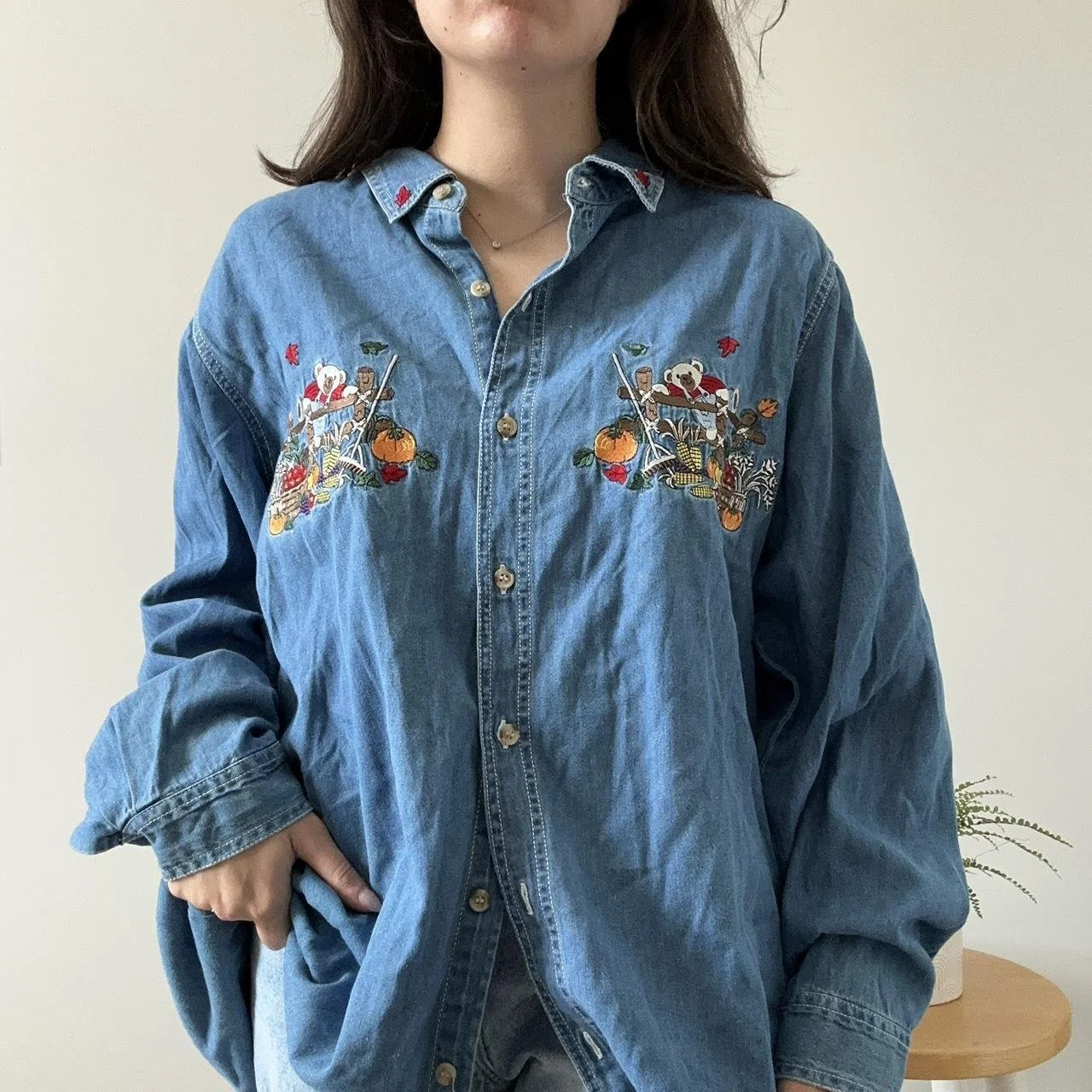 the perfect fall denim top! this denim button down could go for an oversized or fitted look, the detials are perfect for any fall lover, with bears sitting in barrels full of pumpkins and colorful leaves surrounding! size 3xl