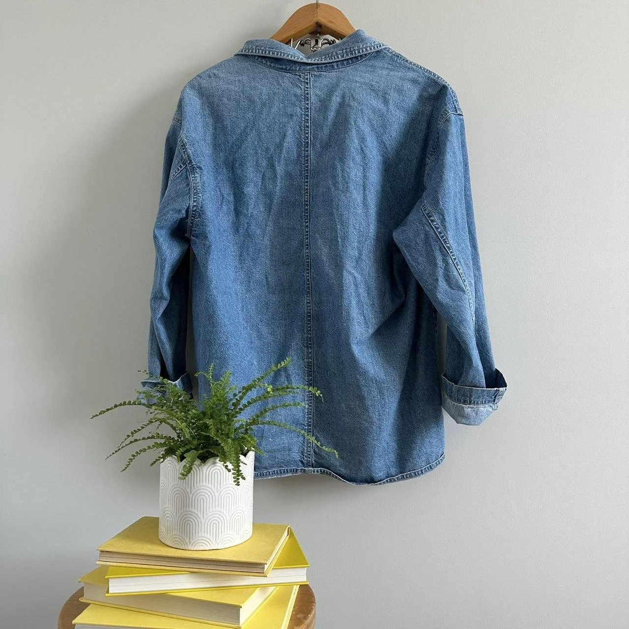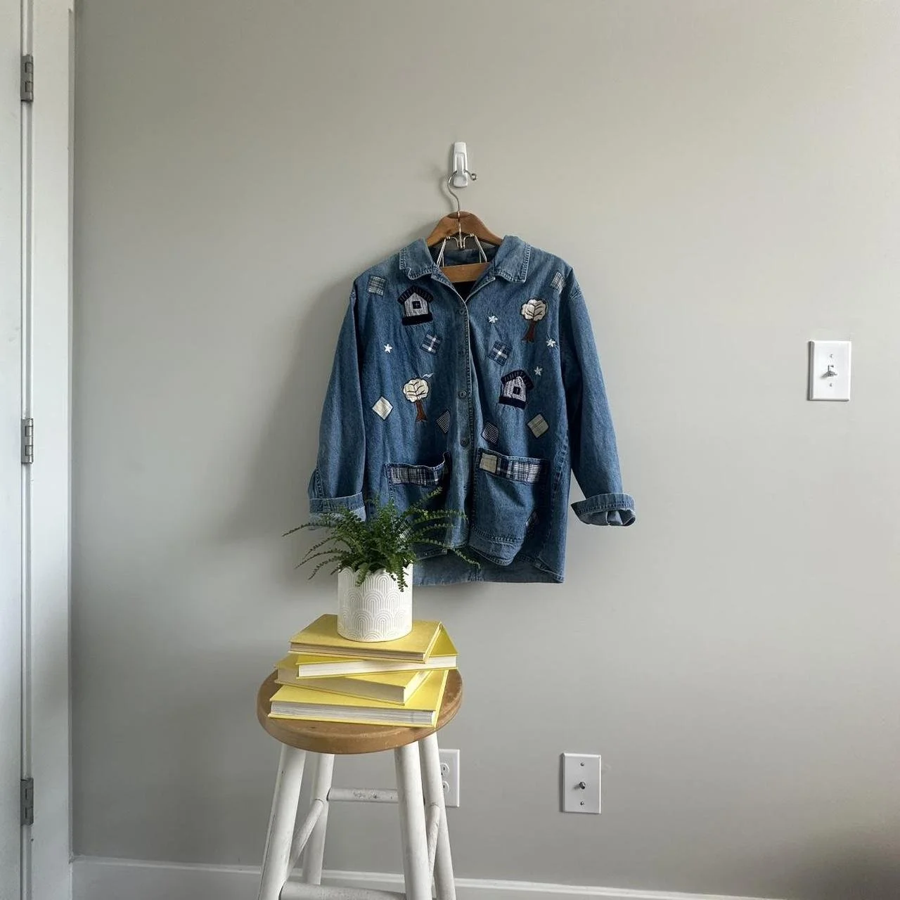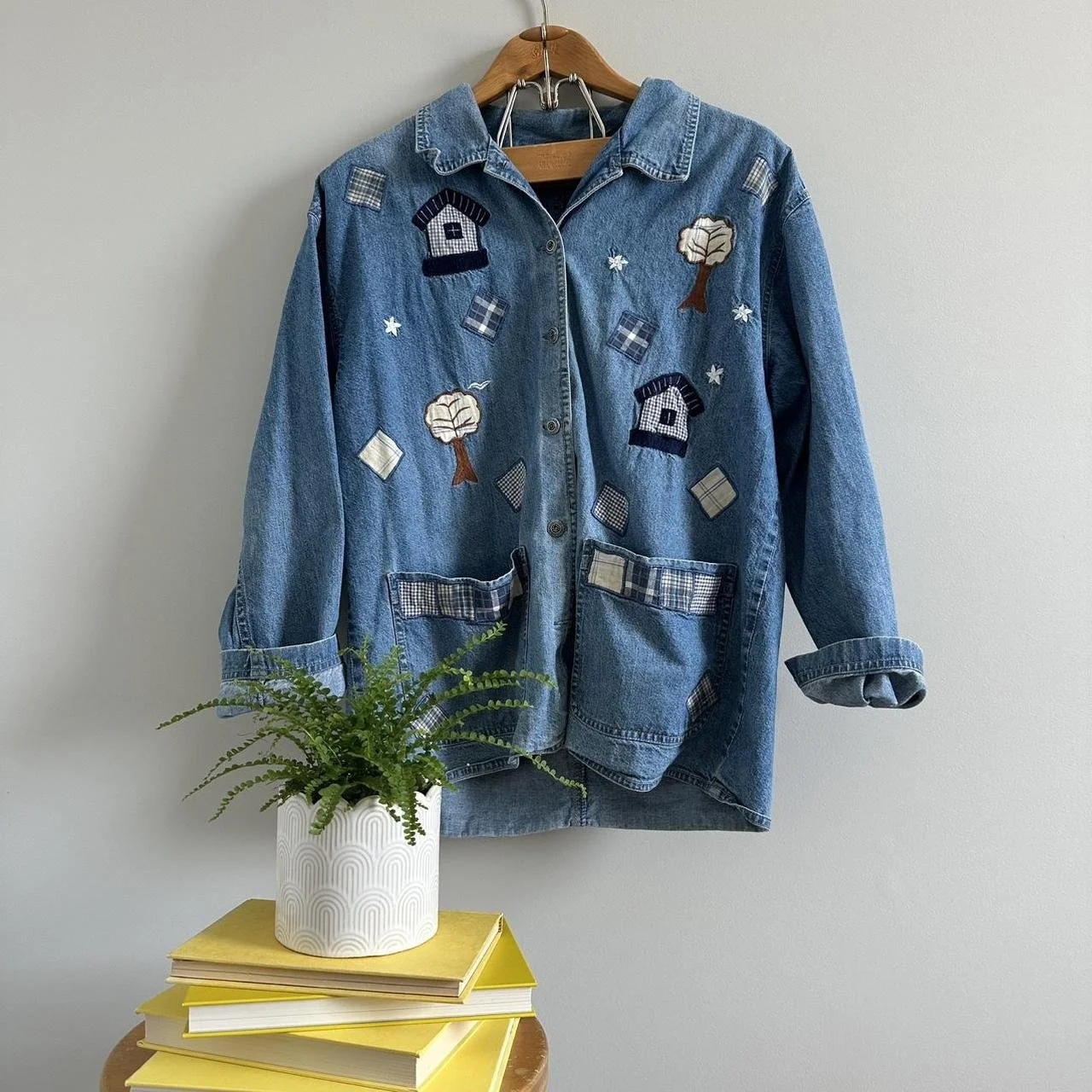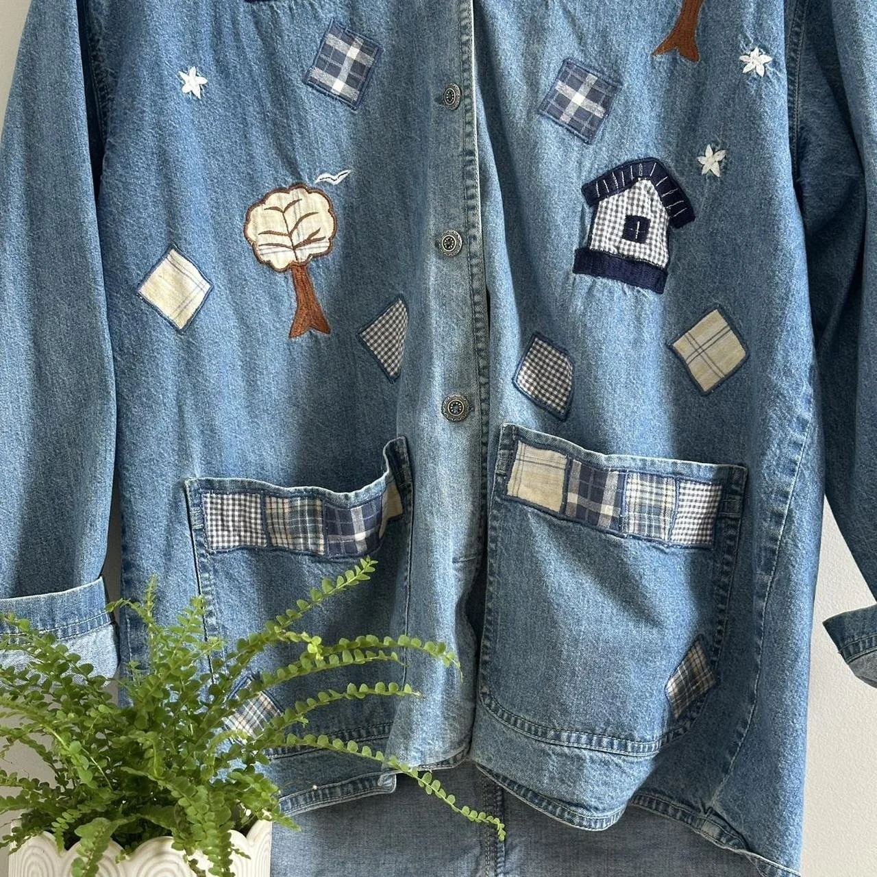 denim jacket/button down perfect for any season! There are little houses and trees all over this denim jacket has two front pockets for added details! Super super cute! size medium