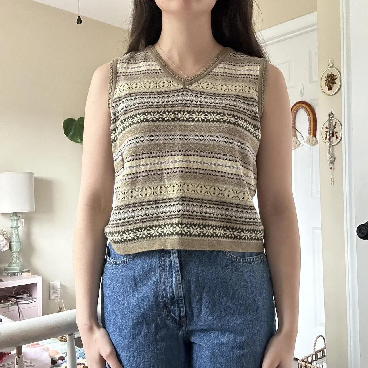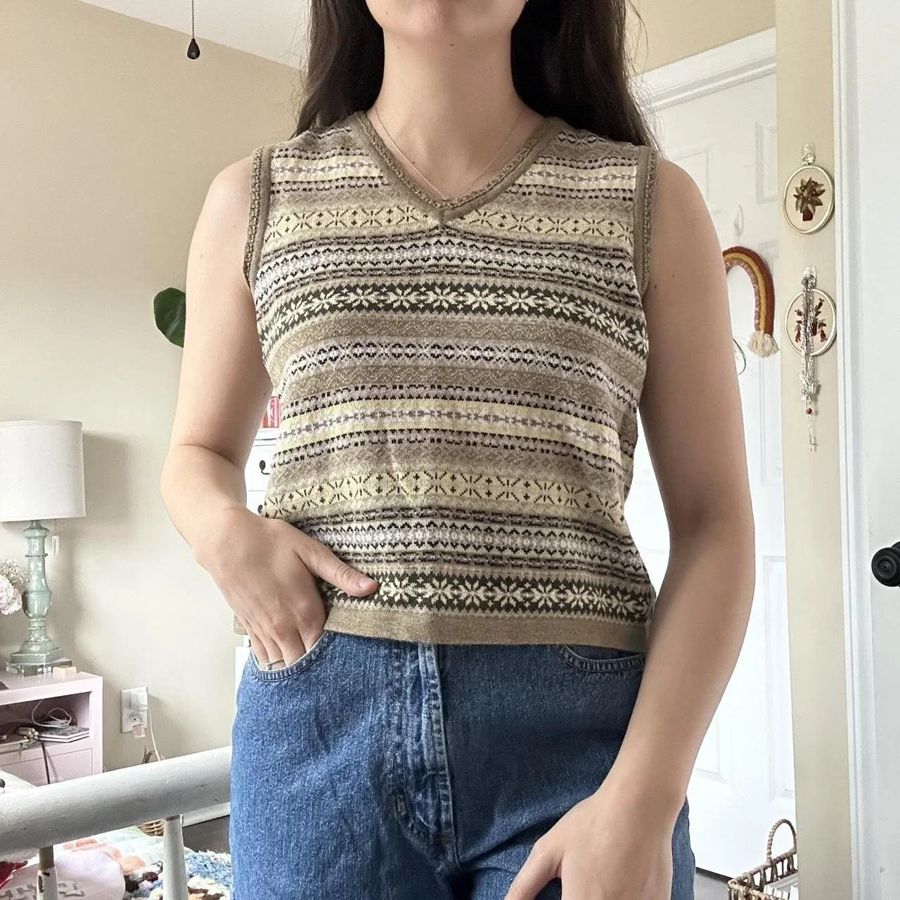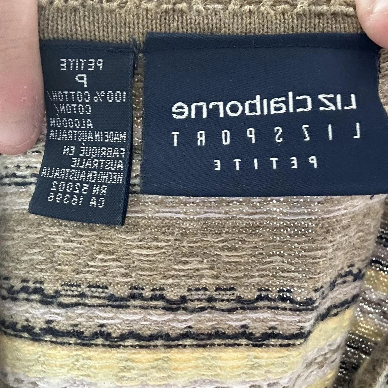 tan vest, by liz claireborn. super soft and nice quality! has strpes with patterns on he inside, the colors are tan, cream, purple, yellow and green! super cute and would be perfect for any season worn on its own or as a layer! size small