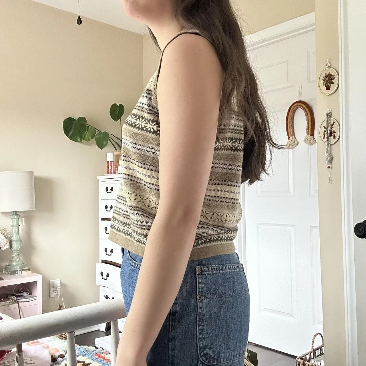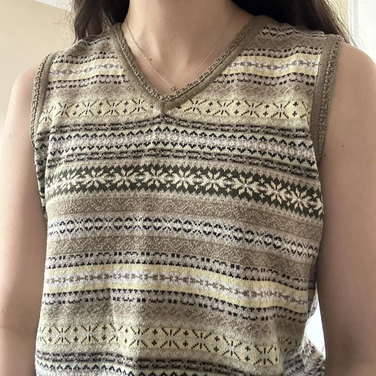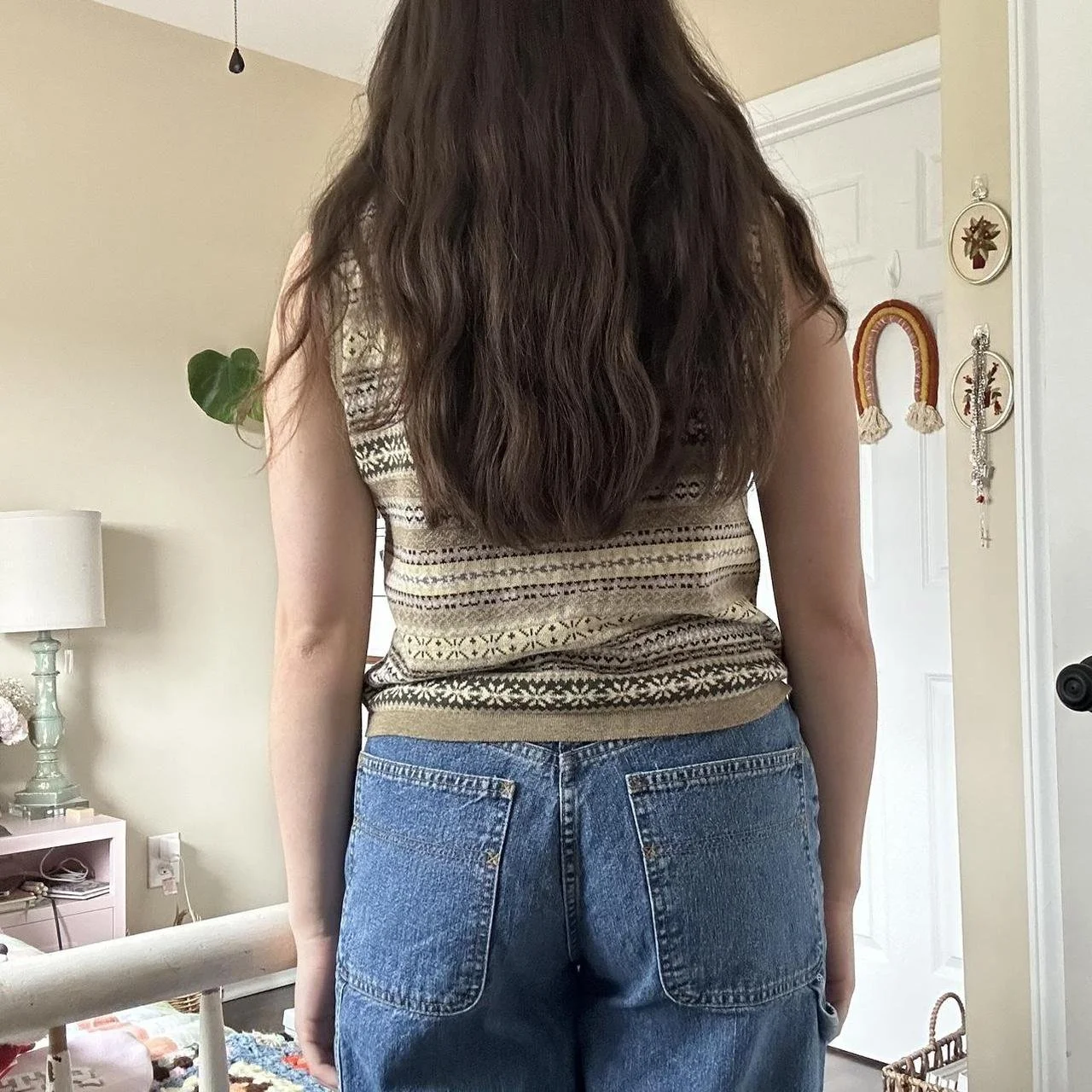 tan vest, by liz claireborn. super soft and nice quality! has strpes with patterns on he inside, the colors are tan, cream, purple, yellow and green! super cute and would be perfect for any season worn on its own or as a layer! size small