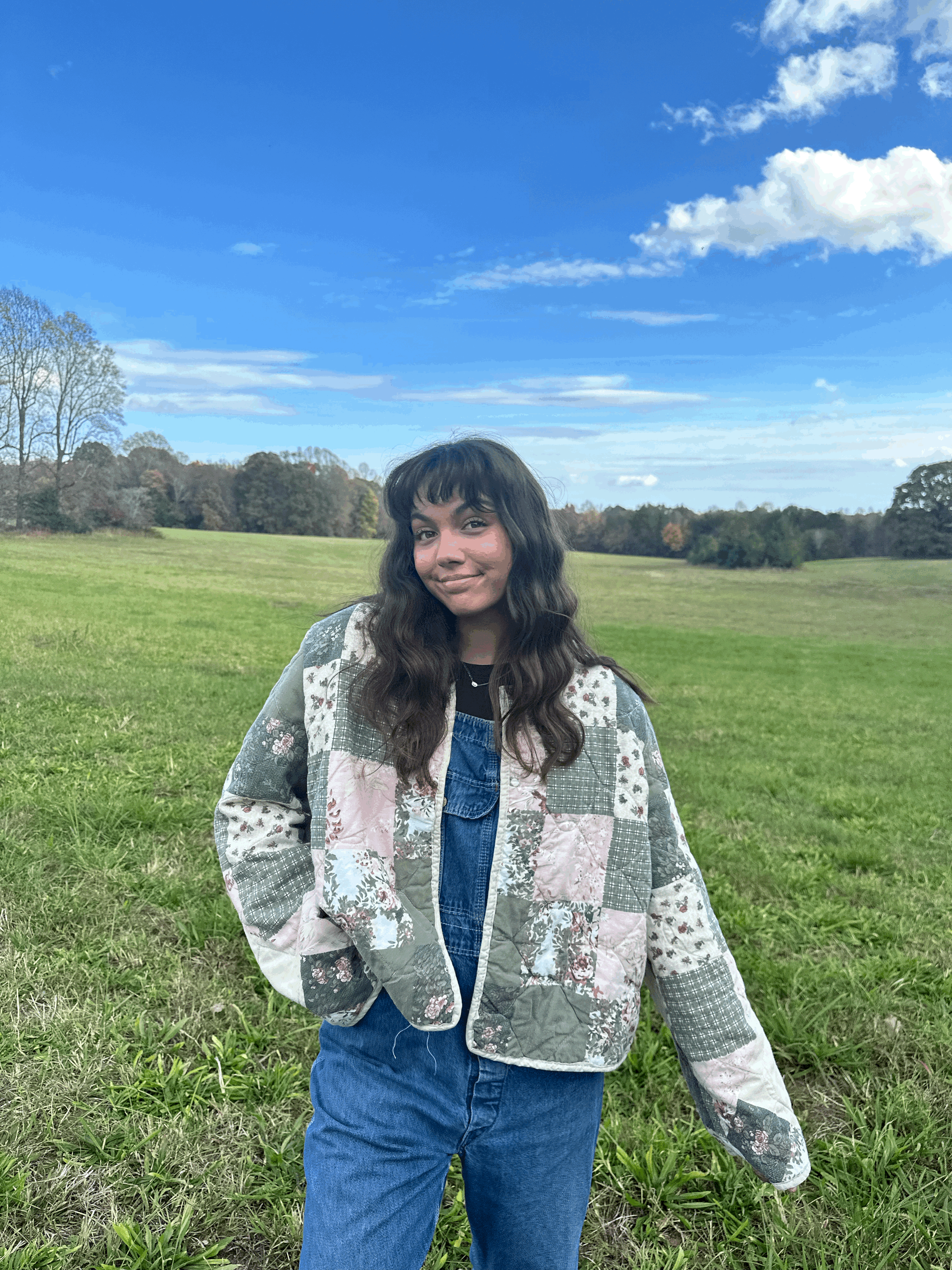 upcyled green floral quilted jacket! light weight quilt jakcet perfect for spring fall and winter! super comfortable! one size in this item and can fit as an oversized or fitted item!